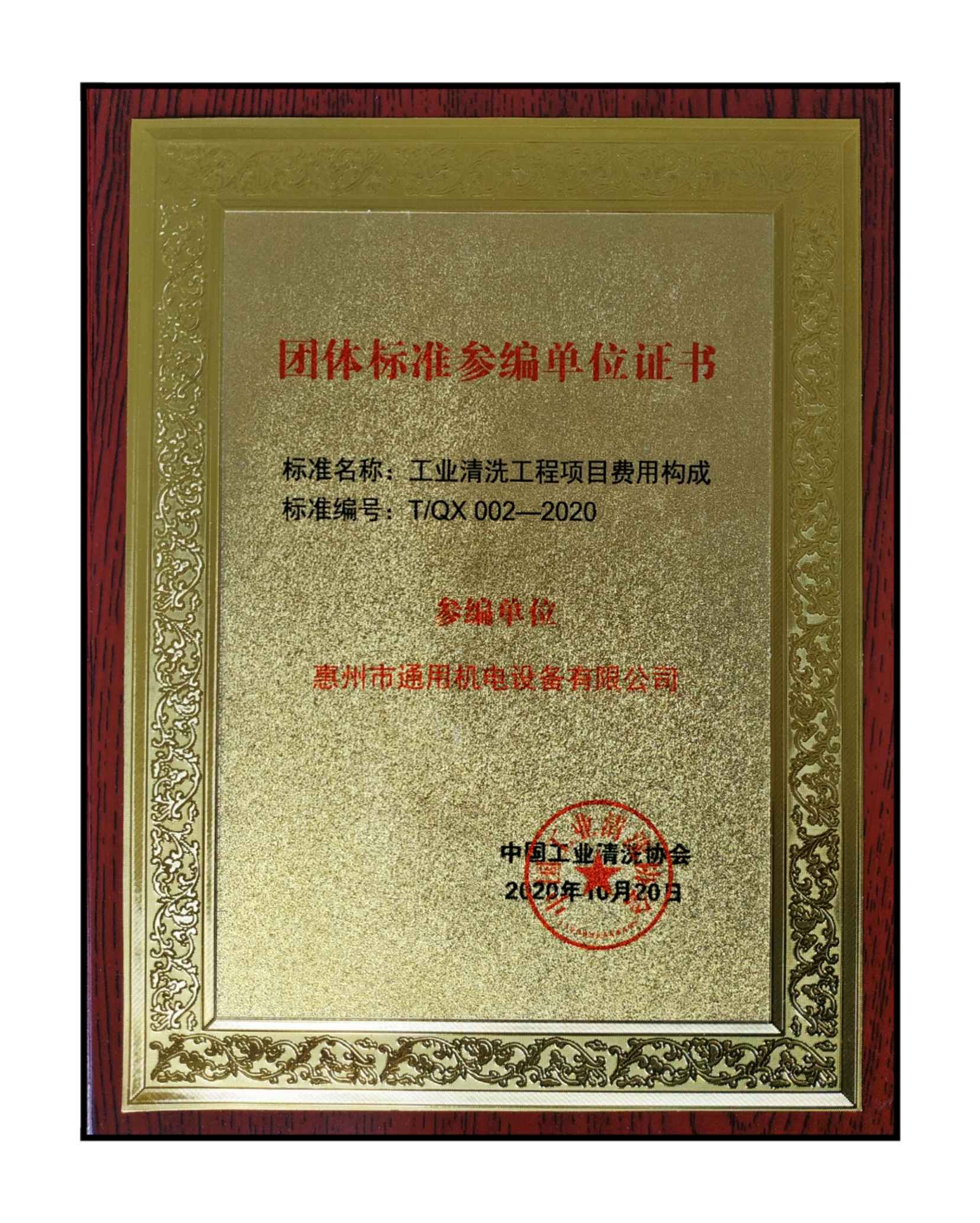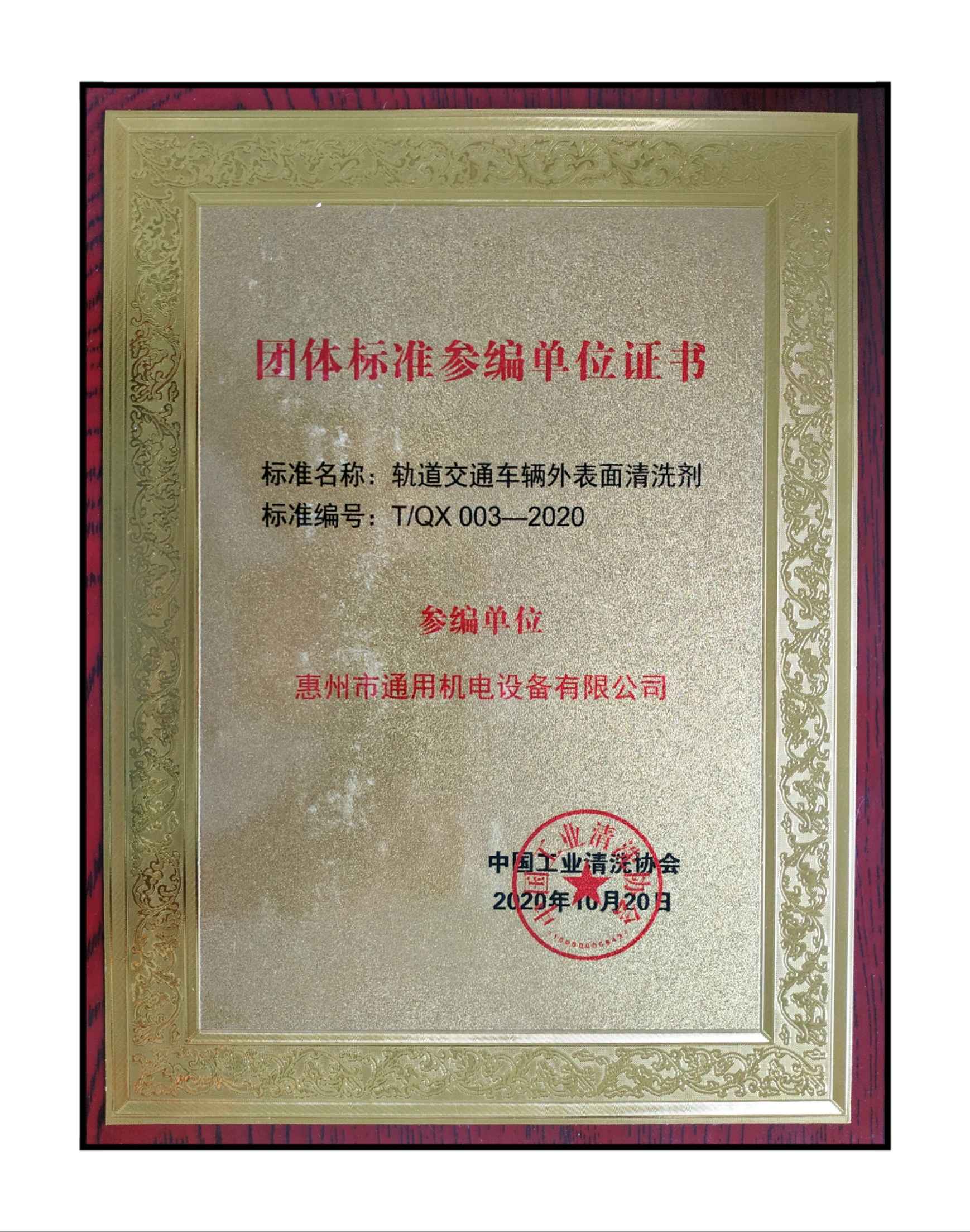 在這4項標(biāo)準(zhǔn)的編制過程中,惠州市通用機(jī)電設(shè)備有限公司積極參與了《工業(yè)清洗工程項目費(fèi)用構(gòu)成》和《軌道交通車輛外表面清洗劑》的編制工作,為行業(yè)標(biāo)準(zhǔn)化工作做出了重要貢獻(xiàn)。協(xié)會也對惠州通用的積極貢獻(xiàn)給予了高度評價及肯定,在第二十屆清洗論壇的現(xiàn)場,協(xié)會向惠州通用頒發(fā)了榮譽(yù)證書和參編單位牌匾。
